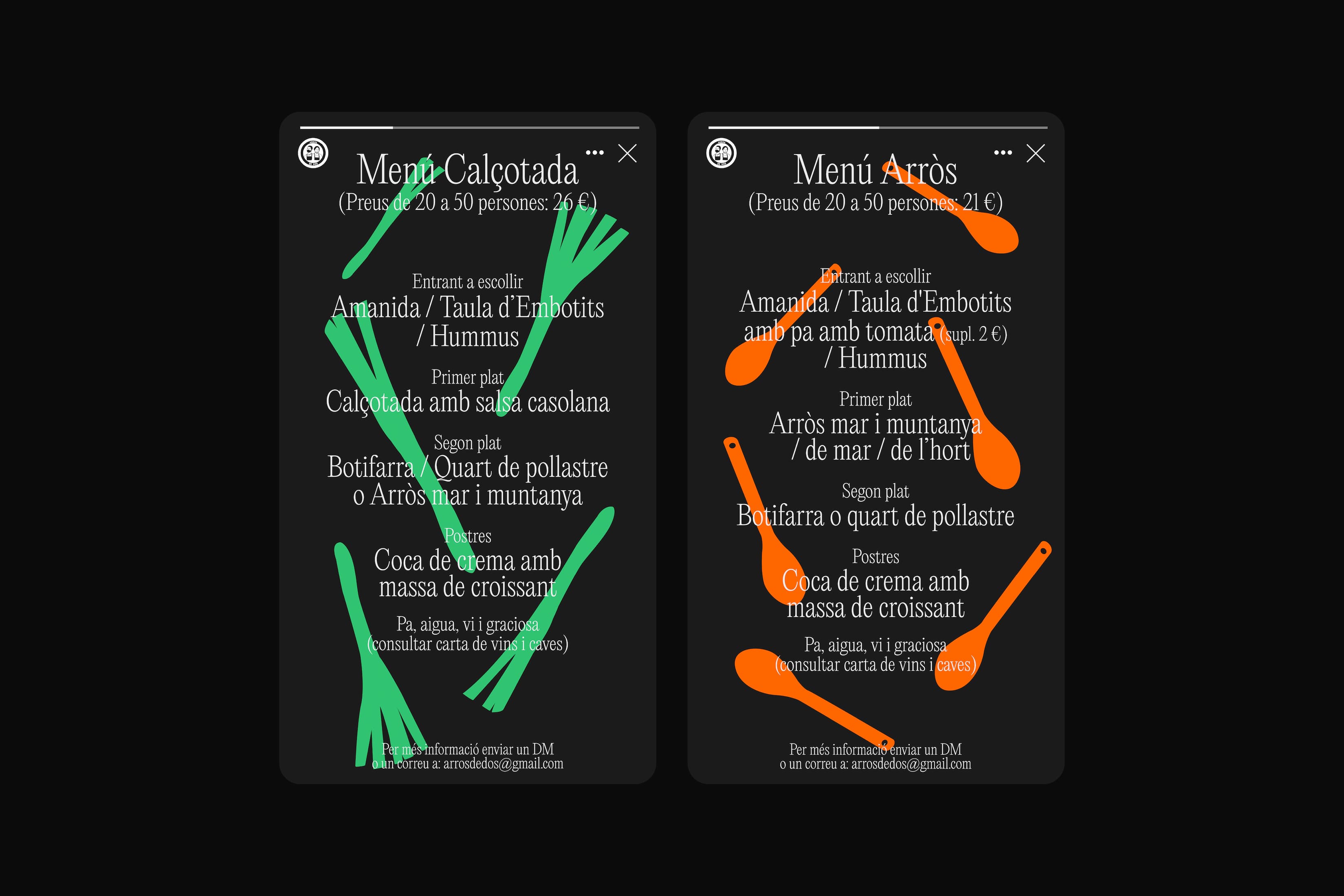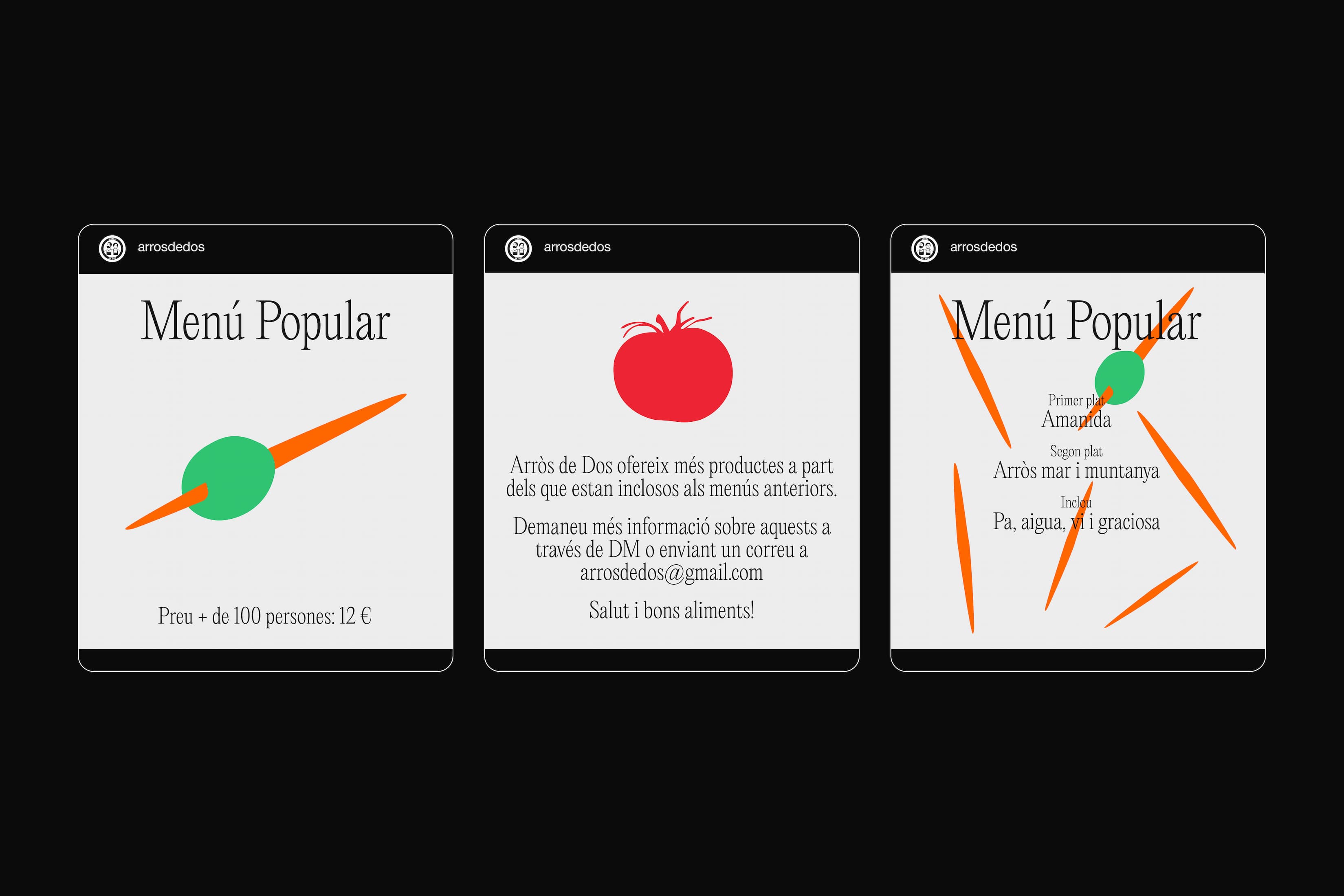 Per captar l'essència d'Arròs de Dos, es dissenya un web dinàmic que mostra la diversitat de serveis que ofereixen a través d'imatges interactives i icones personalitzades. La identitat visual gira entorn del concepte de celebració.